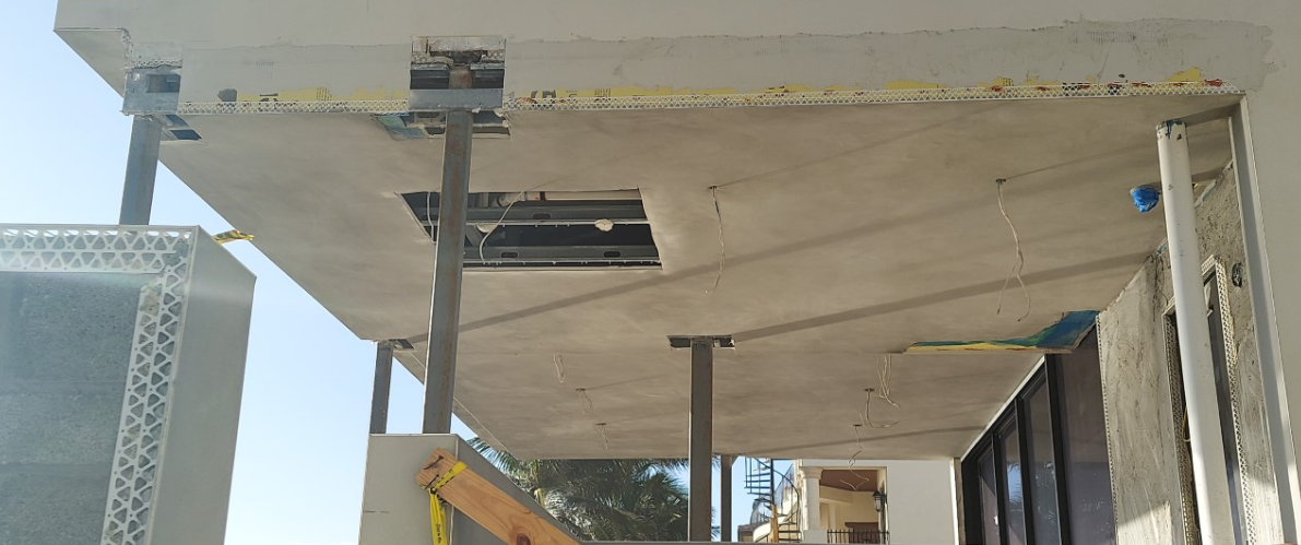 - Summer kitchen. The builders finally began building a summer kitchen out of concrete board and steel studs. After years of exposure to the ocean, will the studs rust? Will the cabinets withstand the test of time? Most high end homes would use concrete block to prevent rusting and maximize durability. When the builders initially poured the concrete deck, they forgot to stub-out for natural gas and electrical. Because of this oversight, the builders had to break a hole in the ceiling and zip tie the wire onto a support. They drilled a hole through the main wall of the house and ran this pipe to the front of the house. I'd recommend potential owners look into the overall workmanship of this project. The left and left-middle images above are from the north side of the house. The image right-middle image shows the view from the south side, showing concrete board rather than block. The image on the right shows the newly installed top of the summer kitchen. One should investigate whether it was manufactured in a factory, rather than being a slab of real granite.