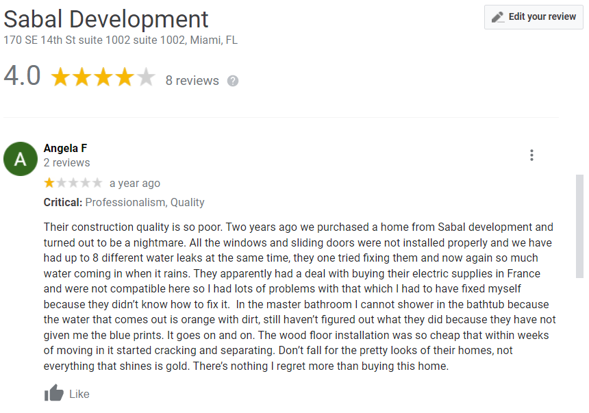 - Negative Google Reviews. The developer doesn't have a strong reputation online. This should concern potential buyers.