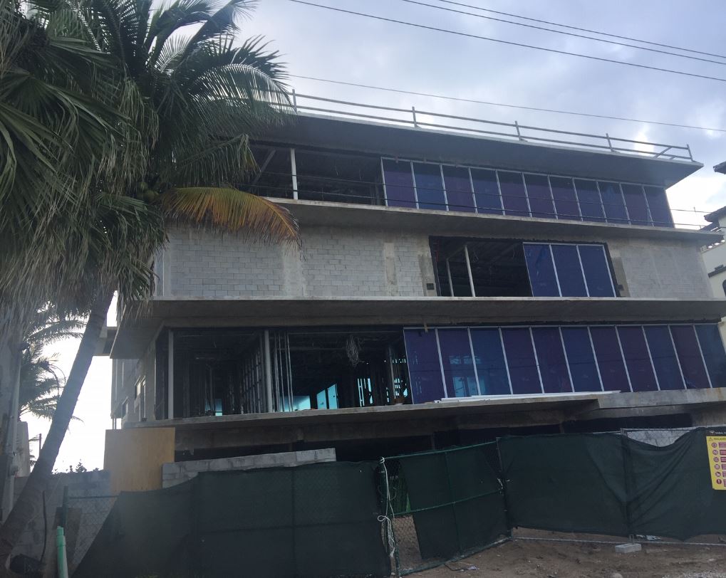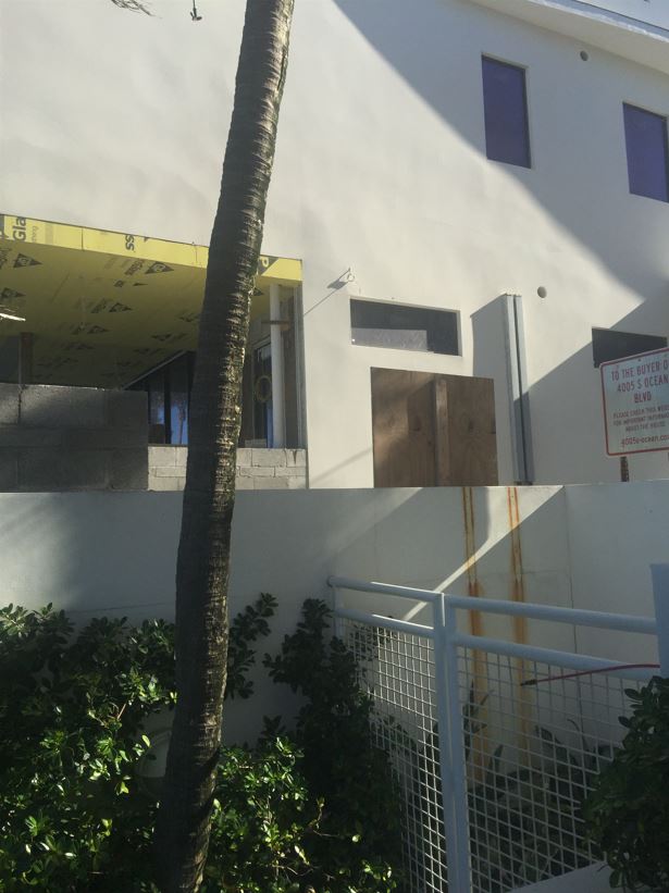 - Exposure to the elements. The front of the home has been wide open for months on end (see images above), exposing the interior, electrical and plumbing to sea spray. Each stage of this project has taken months too long. The overall lack of timeliness should concern any potential buyer. The developers finally installed windows after months and months of exposure, but only installed half of them, leaving wires, piping and metal 2 x 4s exposed. Even today, there are still some missing windows. The home's interior was exposed to the elements during Tropical Storm Eta, which hit the area with 55 mph winds and seven inches of rain. One should wonder what the inside of this house looks like given the extended period of exposure.