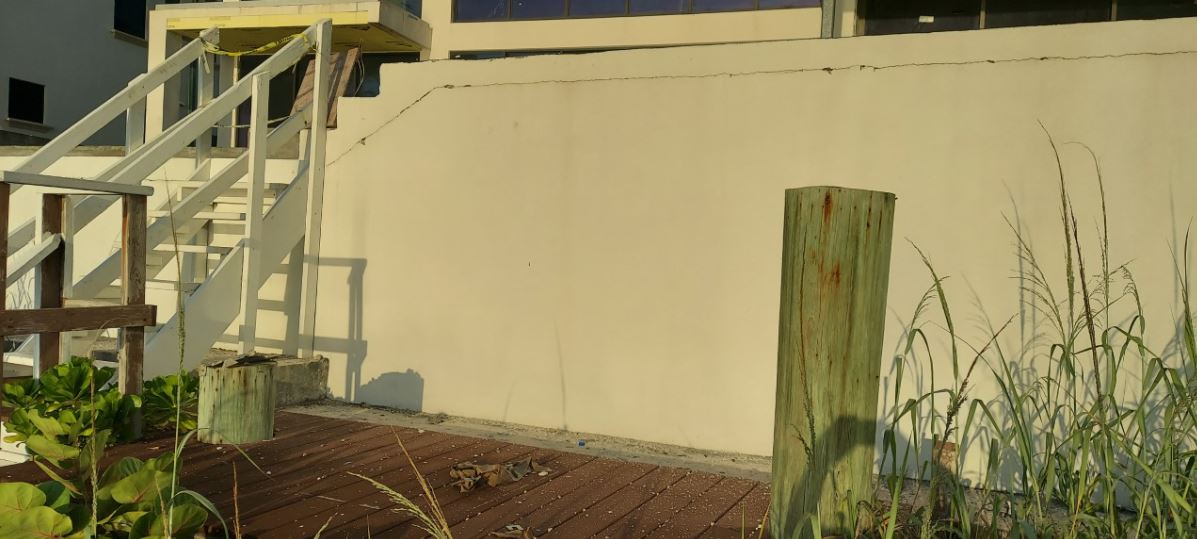 - Cracked Exterior Walls. The photograph above was taken from the beach by neighbors. As the picture demonstrates, there is a large crack that runs horizontally across the top of the exterior wall, as well as diagonally by the stairs. Any perspective buyer of this home should investigate whether this is a structural concern.