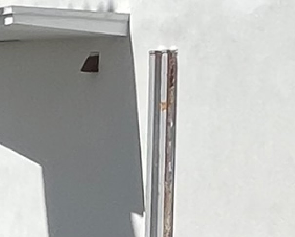 - Rust Everywhere! See image above (top left image), from the north side of the house. Rather than replacing the incredibly rusted part, the developers seem to have covered it with a new piece of metal (top middle image), which could rust in a few years. The same problem exists on the south side of the house (top right image). The bottom image is supporting a large, heavy glass railing.