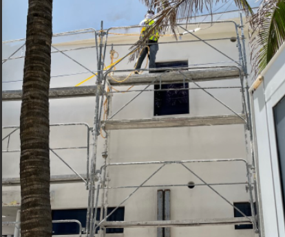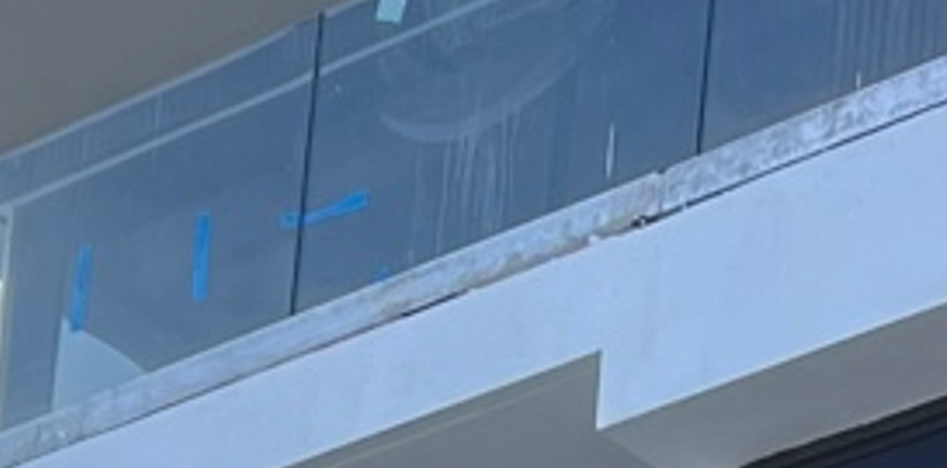 - Rusted support poles. Several times throughout the duration of the project, the metal poles that support the rear of the home have developed rust due to rain and sea spray exposure. On several occasions, the developers have sent workers with grinding equipment to scrape and remove rust from the posts (see image above). Photos taken from the north also show rusted support poles (see image above). This too should concern any potential buyer. Rust on the rear supports is an ongoing problem. You might wonder with so must rust on supports holding up the third floor, is this house safe to life in? Potential buyers should consider hiring a structural engineer to make sure this house will not fall down with you inside. As of January 2022, pictures taken from the south side of the project show major rust around the windows (see image above). As of February 2022, workers in hazmat suits were spotted attempting to repair the rusted support poles. One would wonder why these workers are wearing hazmat suits? Are they trying to prevent something catastrophic from happening? In July 2022, rust reappeared after being removed at least four times in the last 18 months