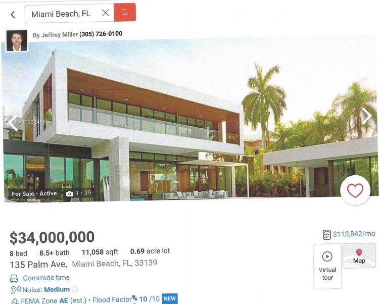 - Valuation and property tax concerns. Sabal Development has listed this home as "An oceanfront estate by acclaimed Sabal Development" for $29.5 million. According to the Palm Beach County Property Tax appraiser's website, property taxes on this house will cost approximately $500,000 per annum, quite the burden for a house with this many concerns. Sabal is listing a very similar home to this one, at 135 Palm Avenue, in Miami Beach. That home is listed for $34 million. Why is 4005 South Ocean Boulevard listed for $7.5 million less? Any prospective buyer should be concerned that the price difference is related to the issues listed above.
