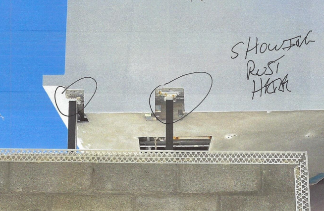 - Rust Everywhere! See image above (top left image), from the north side of the house. Rather than replacing the incredibly rusted part, the developers seem to have covered it with a new piece of metal (top middle image), which could rust in a few years. The same problem exists on the south side of the house (top right image). The bottom image is supporting a large, heavy glass railing.