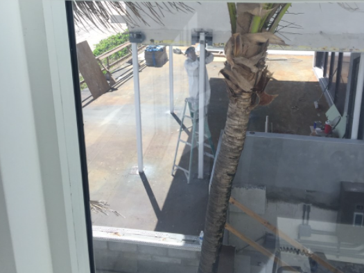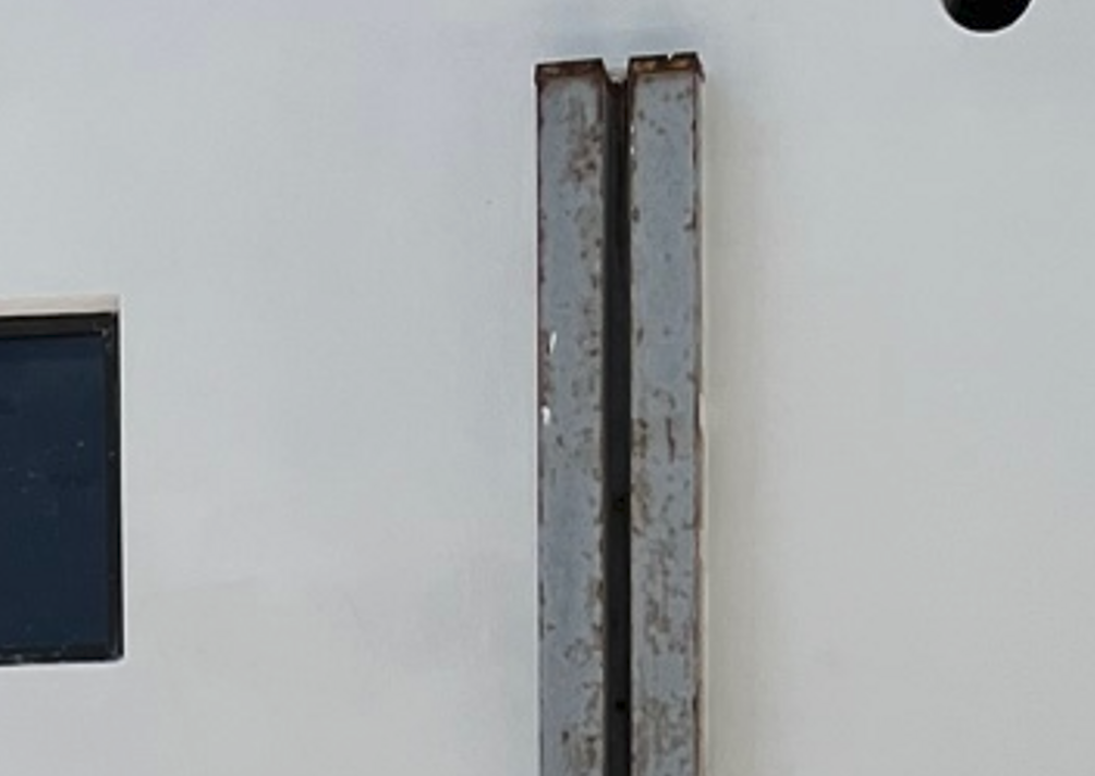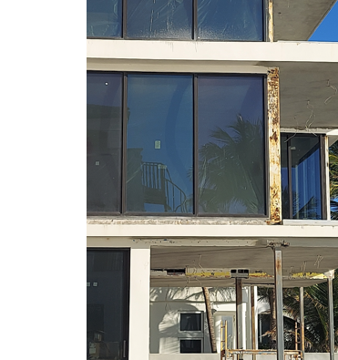 - Rusted support poles. Several times throughout the duration of the project, the metal poles that support the rear of the home have developed rust due to rain and sea spray exposure. On several occasions, the developers have sent workers with grinding equipment to scrape and remove rust from the posts (see image above). Photos taken from the north also show rusted support poles (see image above). This too should concern any potential buyer. Rust on the rear supports is an ongoing problem. You might wonder with so must rust on supports holding up the third floor, is this house safe to life in? Potential buyers should consider hiring a structural engineer to make sure this house will not fall down with you inside. As of January 2022, pictures taken from the south side of the project show major rust around the windows (see image above). As of February 2022, workers in hazmat suits were spotted attempting to repair the rusted support poles. One would wonder why these workers are wearing hazmat suits? Are they trying to prevent something catastrophic from happening? In July 2022, rust reappeared after being removed at least four times in the last 18 months