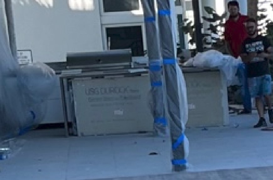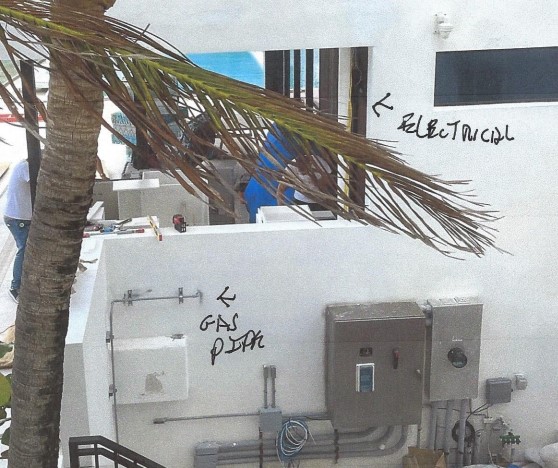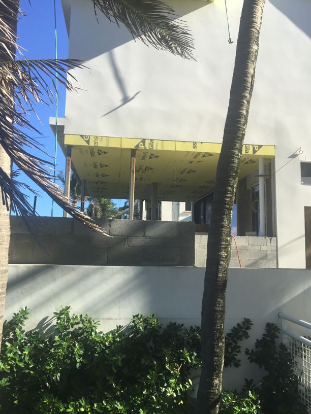- Summer kitchen. The builders finally began building a summer kitchen out of concrete board and steel studs. After years of exposure to the ocean, will the studs rust? Will the cabinets withstand the test of time? Most high end homes would use concrete block to prevent rusting and maximize durability. When the builders initially poured the concrete deck, they forgot to stub-out for natural gas and electrical. Because of this oversight, the builders had to break a hole in the ceiling and zip tie the wire onto a support. They drilled a hole through the main wall of the house and ran this pipe to the front of the house. I'd recommend potential owners look into the overall workmanship of this project. The left and left-middle images above are from the north side of the house. The image right-middle image shows the view from the south side, showing concrete board rather than block. The image on the right shows the newly installed top of the summer kitchen. One should investigate whether it was manufactured in a factory, rather than being a slab of real granite.