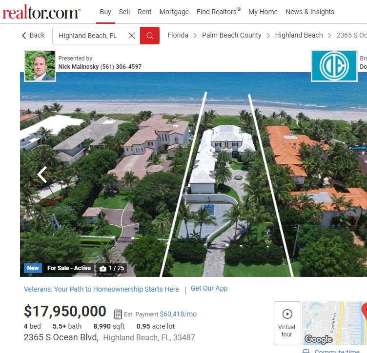 - Better options available locally. A simple search on realtor.com revealed several turnkey oceanfront listings on S. Ocean Boulevard. The listing above is a 415 ft. deep lot down the street that is over $8 million less expensive than 4005 S. Ocean Boulevard. One would wonder why it would make sense to wait several years for the home at 4005 S. Ocean Boulevard to be built when this alternative is available today for 32% less (and lower property taxes). There is no way that the home at 4005 S. Ocean is actually worth $29.5 million.